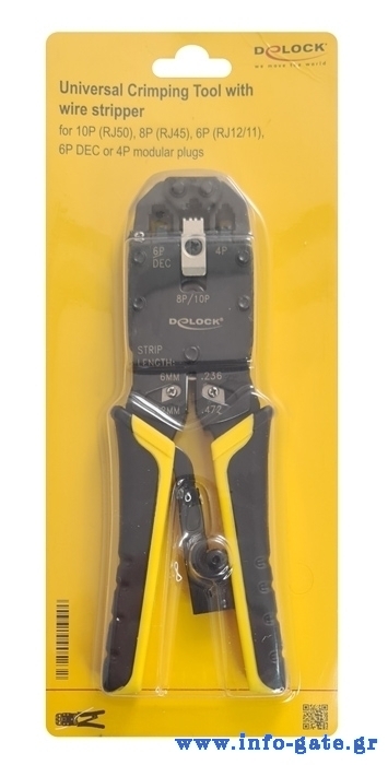 Αυτή η πρέσα ακροδεκτών δικτύου από την Delock είναι κατάλληλη για σύσφιξη, απογύμνωση και κοπή υποδοχών μονάδας 10P (RJ50), 8P (RJ45), 6P (RJ12/11) ή 4P.