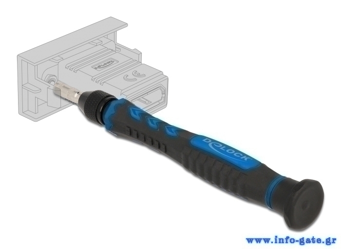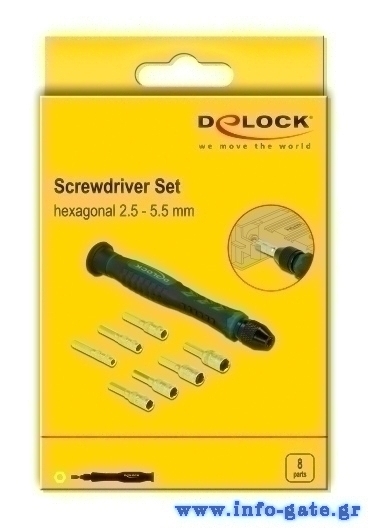 Πρακτικό σετ από την Delock που περιλαμβάνει ένα κατσαβίδι και 7 διαφορετικές εξάγωνες bit κεφάλες. Το κατσαβίδι διαθέτει σπείρωμα με κλείδωμα, παρόμοιο με τρυπάνι, το οποίο κρατά τις κεφαλές με ασφάλεια ενώ η αντιολισθητική λαβή του το καθίστα εξαιρετικά σταθερό κατά την εργασία.
