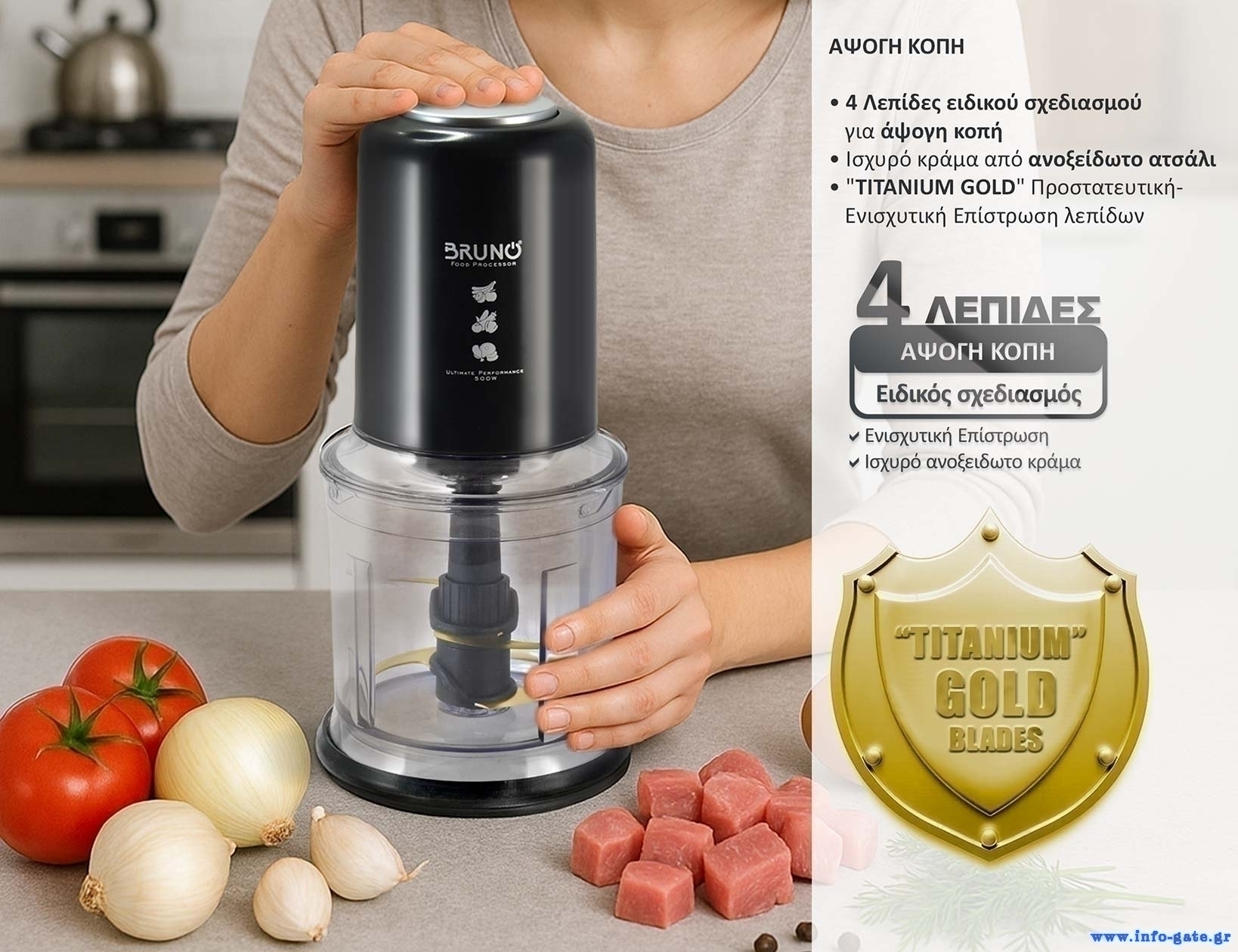 Χαρακτηριστικά του η άψογη κοπή και η γρήγορη-άνετη χρήση, χάρις στις 4 λεπίδες ειδικού σχεδιασμού "TITANIUM GOLD", στο πανίσχυρο τύπο μοτέρ 500W καθώς και την στιβαρή κατασκευή μηχανικών τμημάτων με μεταλλικά γρανάζια μετάδοσης κίνησης.