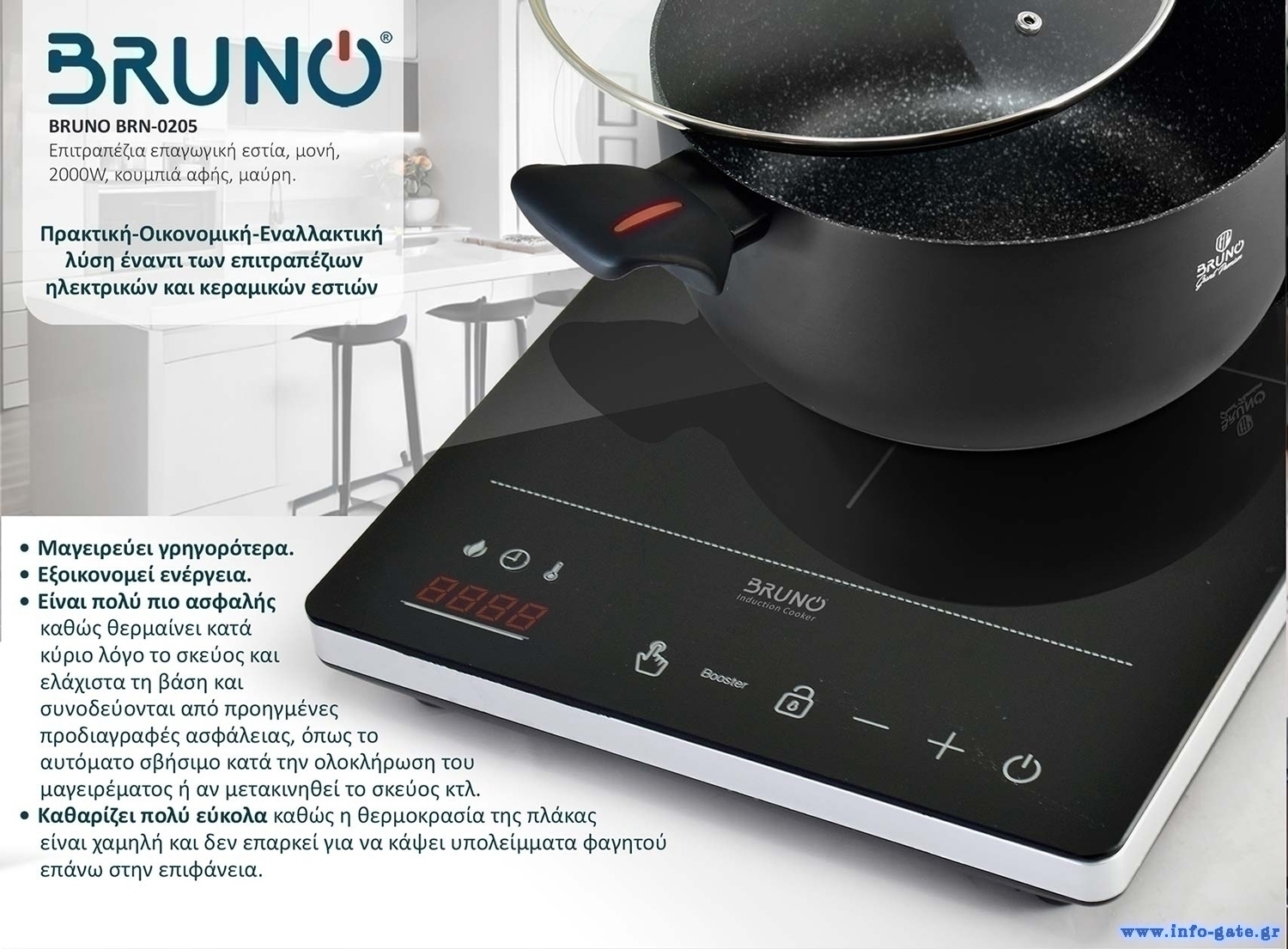 Η επιτραπέζια επαγωγική εστία BRUNO BRN-0205 είναι ιδανική για κάθε κουζίνα, για μικρά ή μεγάλα νοικοκυριά και οικογένειες. Προσφέρει έναν εναλλακτικό τρόπο για άνετο καθημερινό μαγείρεμα και συνδυάζει πρακτικότητα, οικονομία, εξοικονόμηση χρόνου και εύκολο καθάρισμα.