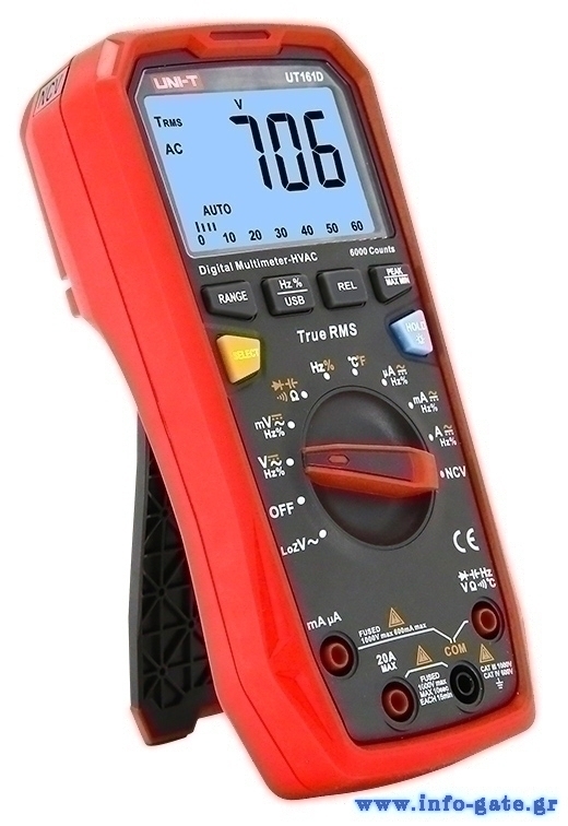 Το UT161D είναι ένα αξιόπιστο True RMS ψηφιακό πολύμετρο με μέγιστο αριθμό μέτρησης οθόνης 6000 ψηφίων. Μπορεί να μετρήσει έως 1000V AC/DC και διαθέτει οπτικοακουστικό συναγερμό. Μπορεί να σας παρέχει προειδοποίηση ιδιαίτερα όταν μετράτε υψηλή τάση/ρεύμα και θερμοκρασία.