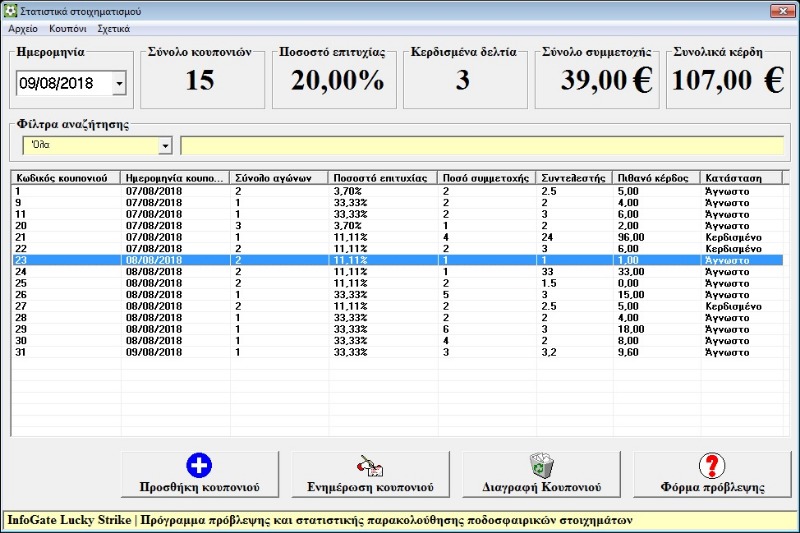 6. Υπάρχει δυνατότητα αποθήκευσης του κουπονιού και των καταχωρίσεων στην βάση δεδομένων μαζί με το ποσοστό κέρδους , το ποσό συμμετοχής και τον συντελεστή (ολοκληρώθηκε στις 03/08/2018)