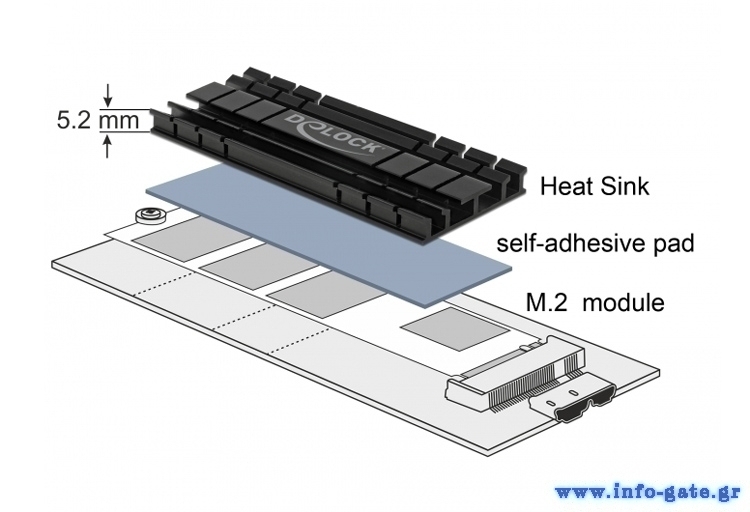 This heat sink by Delock can be used for heat dissipation of an M.2 module and can be fixed with the attached self-adhesive thermal pads to the M.2 module