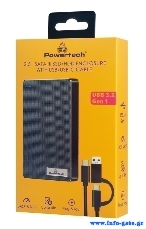 Η θήκη της Powertech επιτρέπει την σύνδεση ενός 2.5" SATA HDD ή SSD με έναν επιτραπέζιο ή φορητό υπολογιστή μέσω θύρας USB ή USB-C.