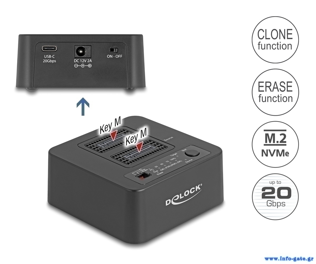 DELOCK docking station για M.2 NVMe SSD 64300, 2 θέσεων, 20Gbps, clone/erase function, μαύρο