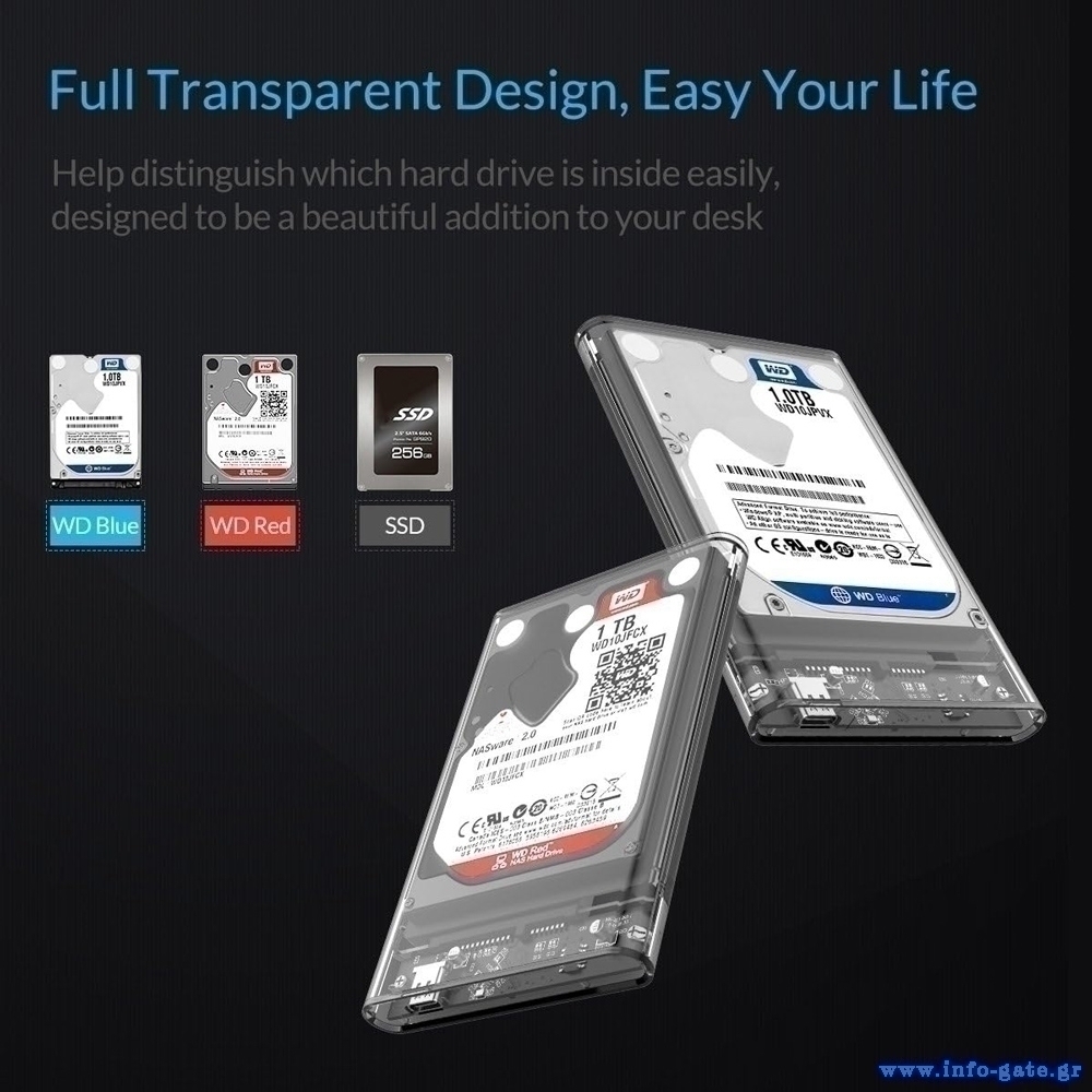 Η θήκη της ORICO επιτρέπει την σύνδεση ενός 2.5" SATA HDD ή SSD με έναν επιτραπέζιο ή φορητό υπολογιστή μέσω θύρας USB.