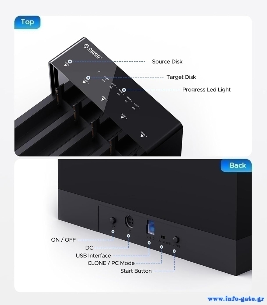 Υποστηρίζει λειτουργία κλωνοποίησης που επιτρέπει την αντιγραφή περιεχομένου από ένα HDD/SSD σε άλλο χωρίς τη χρήση υπολογιστή.