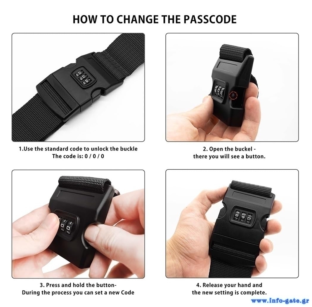 Για αλλαγή του κωδικού, αποσυνδέστε τον ιμάντα και στην δεξιά εγκοπή, όπως βλέπετε τον συνδυασμό, πιέστε και κρατήστε το στρογγυλό κουμπί με το δάχτυλο σας. Αλλάξτε τον κωδικό στον επιθυμητό συνδυασμό αριθμών και αφήστε το κουμπί. Ο συνδυασμός έχει αλλάξει.