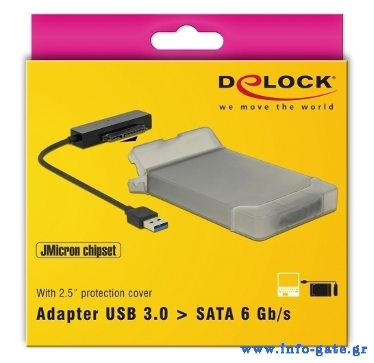 Αυτός ο αντάπτορας USB σε SATA της Delock μπορεί να χρησιμοποιηθεί για την σύνδεση ενός 2.5" SATA HDD ή SSD με έναν επιτραπέζιο ή φορητό υπολογιστή. Μαζί με τον αντάπτορα συμπεριλαμβάνεται και θήκη προστασίας για την εισαγωγή ενός SSD ή HDD με ύψος έως 9.5mm.