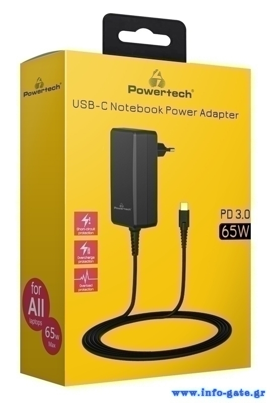 Φορτιστής τοίχου της Powertech για την φόρτιση laptop μέσω θύρας USB-C. Υποστηρίζει πρωτόκολλο γρήγορης φόρτισης PD 3.0 με μέγιστη απόδοση έως 65W.