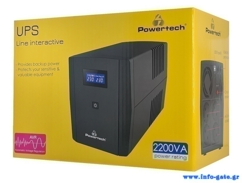 POWERTECH UPS Line Interactive PT-1298 με οθόνη, 2200VA, 1320W, 4x Schuko, 2x RJ45/RJ11, USB Type B