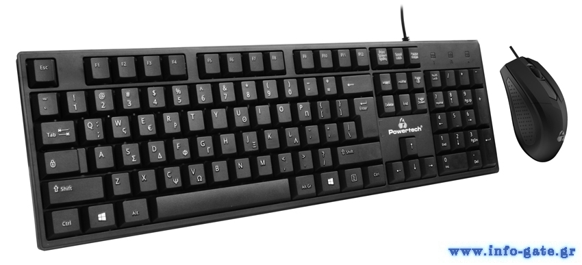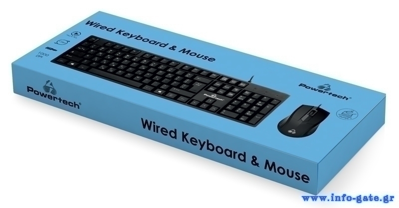 Set περιφερειακών για PC από την Powertech που αποτελείται από ενσύρματο πληκτρολόγιο και ενσύρματο οπτικό ποντίκι.