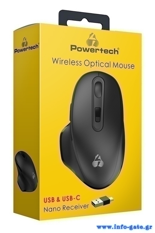 POWERTECH ασύρματο ποντίκι PT-1152, USB & USB-C δέκτη, 1600DPI, μαύρο