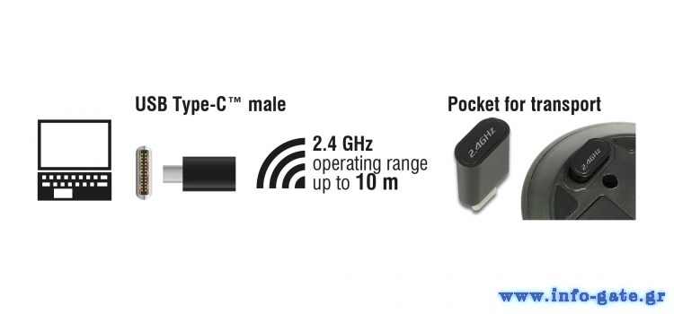 Αυτό το ασύρματο ποντίκι της Delock συνδέεται με τον υπολογιστή μέσω του ψηφιακού δέκτη USB Type-C. Κατά τη διάρκεια της μεταφοράς, το receiver μπορεί να τοποθετηθεί στην ειδική υποδοχή, στο κάτω μέρος του ποντικιού. Η ασύρματη τεχνολογία 2.4GHz παρέχει μέγιστο εύρος λειτουργίας έως 10 μέτρα. Το μικρό του μέγεθος καθιστά το ποντίκι ιδανικό σε ταξίδια.