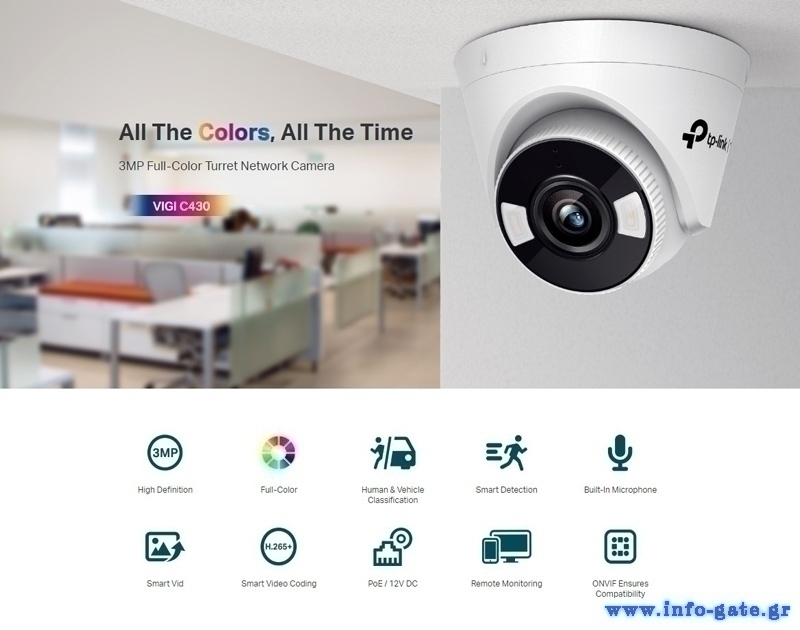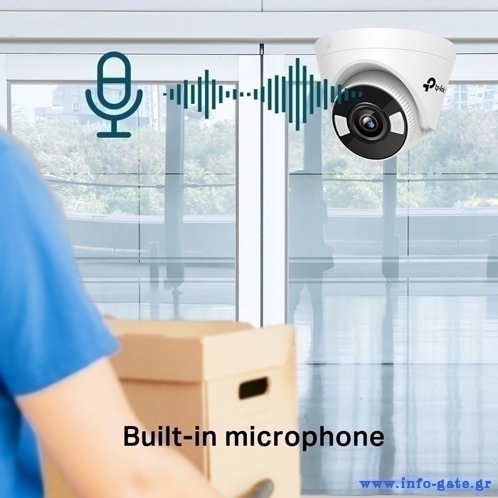 Δικτυακή κάμερα της TP-LINK με φακό 4mm και αισθητήρα ανάλυσης 3MP. Υποστηρίζει έγχρωμη νυχτερινή όραση, τροφοδοσία PoE και εξοπλίζεται με εσωτερικό μικρόφωνο για μεταφορά ήχου.