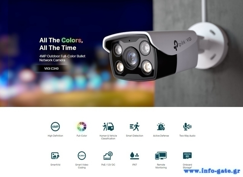 Δικτυακή κάμερα της TP-LINK με φακό 4mm και αισθητήρα ανάλυσης 4MP. Υποστηρίζει έγχρωμη νυχτερινή όραση, τροφοδοσία PoE, καταγραφή σε κάρτα micro SD (δεν συμπεριλαμβάνεται) και εξοπλίζεται με εσωτερικό μικρόφωνο και ηχείο για αμφίδρομη μεταφορά ήχου.