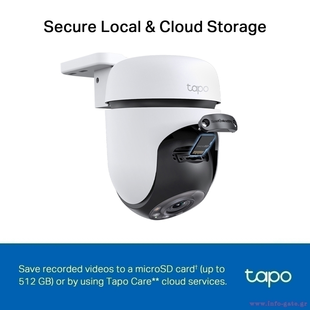 Αποθηκεύστε τα εγγεγραμμένα βίντεο σε μια κάρτα micro SD (έως 512 GB) ή χρησιμοποιήστε την υπηρεσία αποθήκευσης cloud Tapo Care.