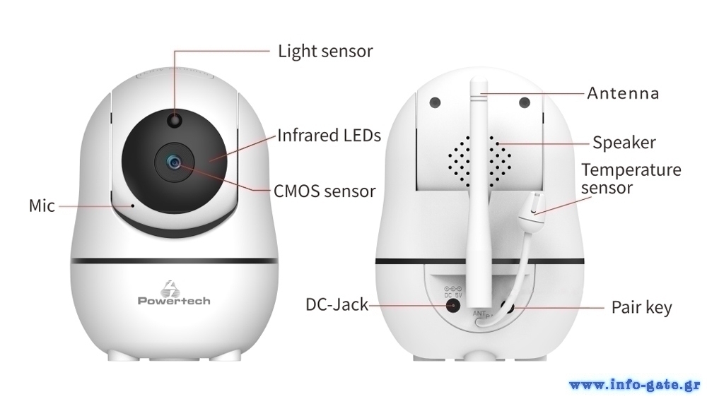 Ασύρματη ενδοεπικοινωνία μωρού της Powertech που αποτελείται από κάμερα και οθόνη 5".