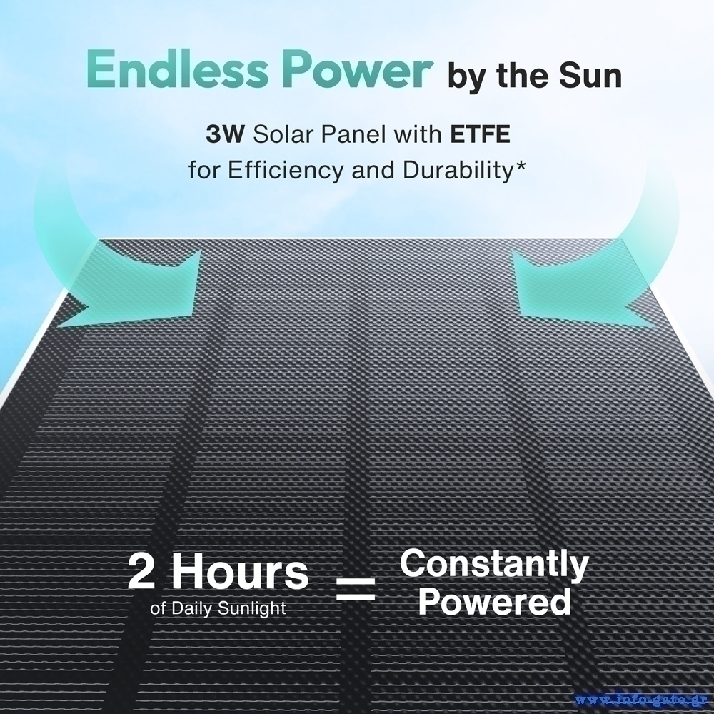 Τροφοδοτείται από ενσωματωμένη μπαταρία η οποία επαναφορτίζεται με ηλιακή ενέργεια χάρη στο ηλιακό πάνελ.