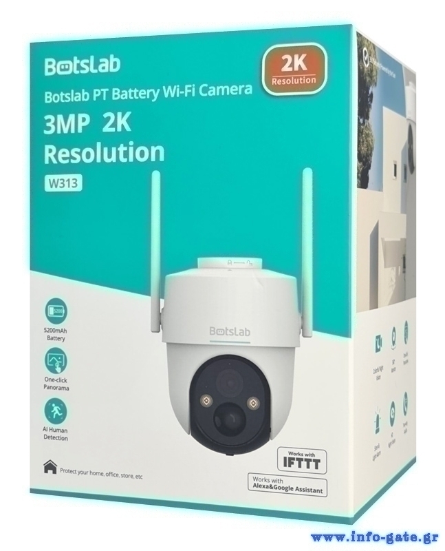 BOTSLAB smart ηλιακή κάμερα W313, 3MP/2K, WiFi, PTZ, SD, 5200mAh, IP65