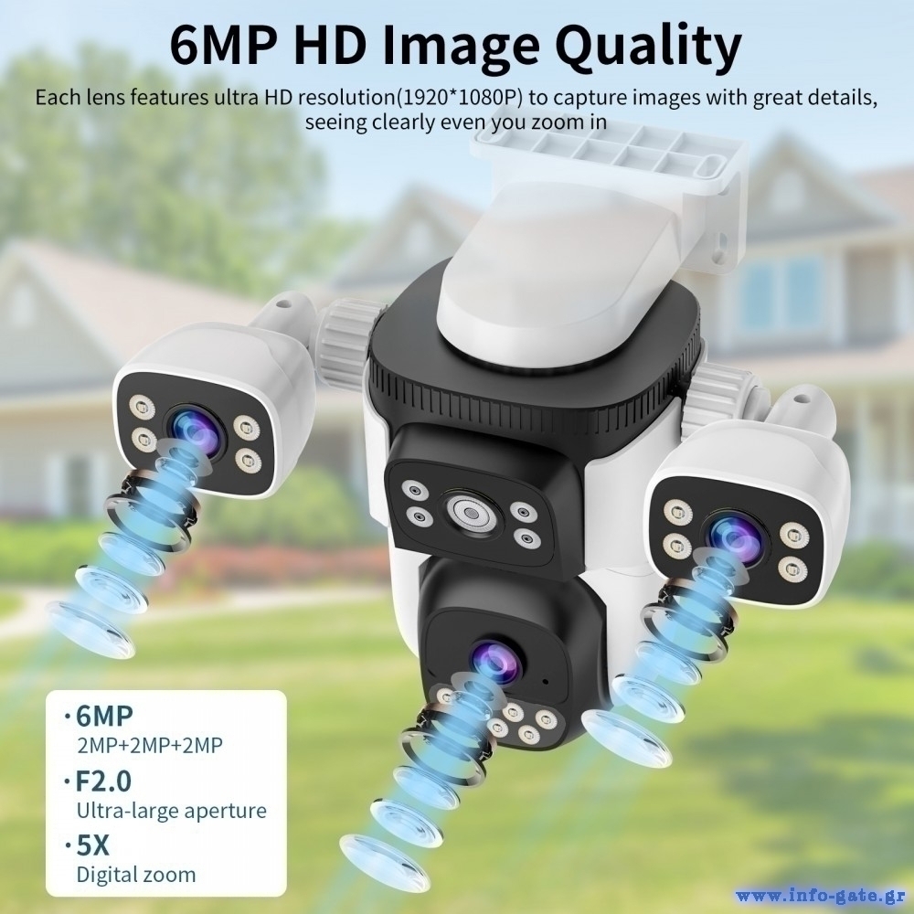 Ενσωματώνει 3 φακούς που επιτρέπουν μεγαλύτερη κάλυψη στον χώρο και υποστηρίζει PTZ λειτουργία που σας επιτρέπει την οριζόντια και κάθετη μετακίνηση της κάμερας μέσω της εφαρμογής.