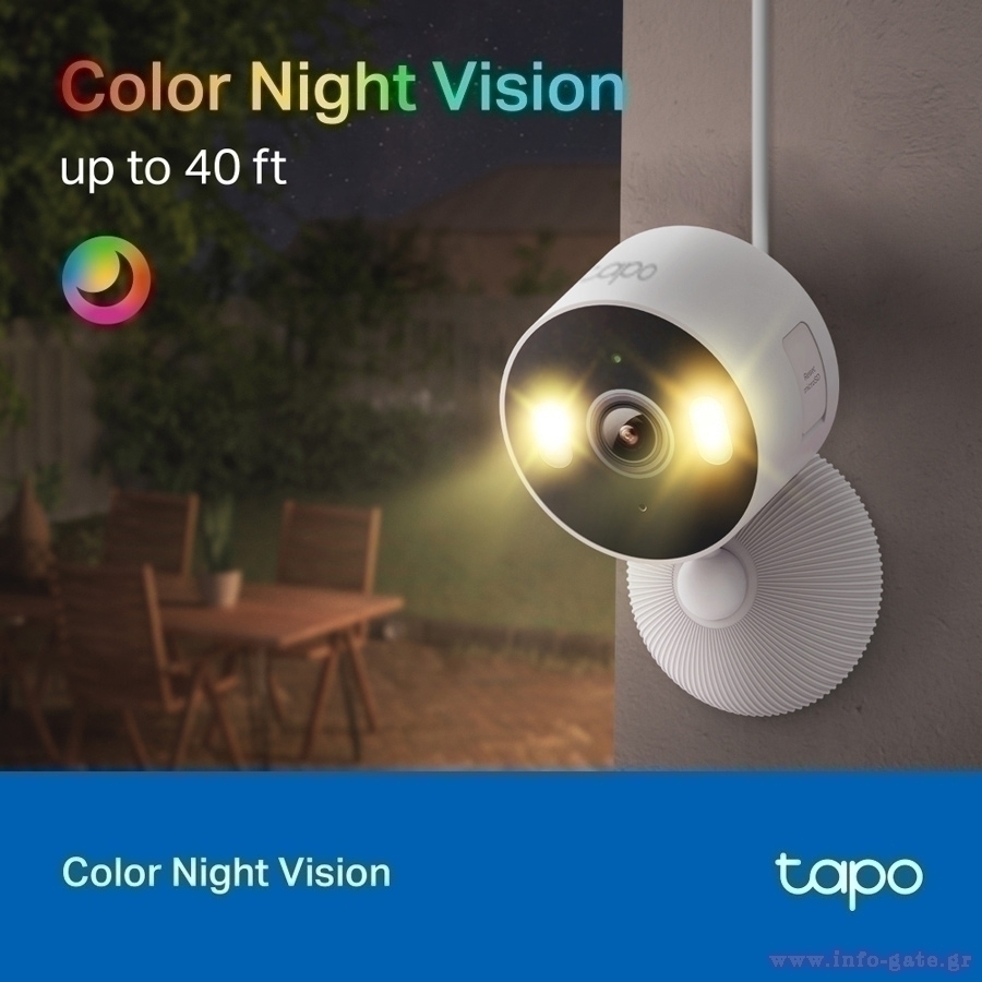 Ενσωματωμένα διπλά Spotlights - Με τα διπλά σποτ της Tapo C113, διαπεράστε το σκοτάδι και τις συνθήκες χαμηλού φωτισμού για μια βελτιωμένη εμπειρία θέασης τη νύχτα, ενώ παράλληλα προβάλλετε την εικόνα σε πλήρες χρώμα.
