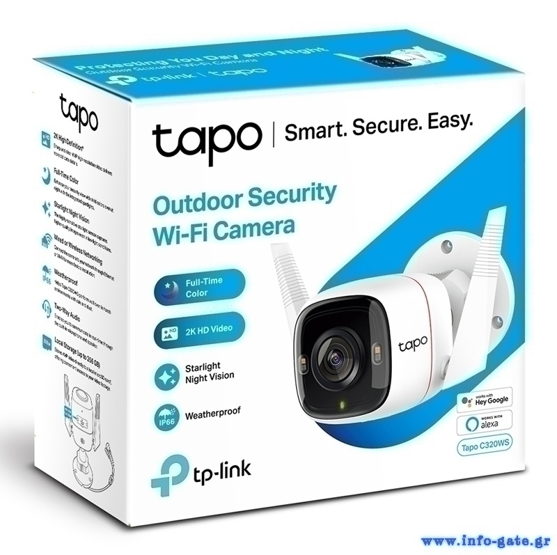 Η Wi-Fi εξωτερική κάμερα ασφαλείας TAPO-C320WS της TP-LINK, καταγράφει ακόμη και τις πιο μικρές λεπτομέρειες, σε ανάλυση 2560x1440 QHD, ακόμη και κατά την διάρκεια της νύχτας. Υποστηρίζει την τεχνολογία Motion Detection και Notifications, με την οποία ανιχνεύει κάθε κίνηση και ειδοποιεί με μήνυμα. Εξοπλίζεται με ηχείο και μικρόφωνο, επιτρέποντας την αμφίδρομη επικοινωνία με τα άτομα που βρίσκονται στον χώρο και έχει λειτουργία εκφοβισμού ανεπιθύμητων επισκεπτών με φως και ήχο. Έχει τη δυνατότητα αποθήκευσης αρχείων έως 256GB, σε κάρτα SD (δεν συμπεριλαμβάνεται). Είναι συμβατή με Google Assistant και Amazon Alexa για έλεγχο μέσω φωνητικών εντολών (σημείωση: ο φωνητικός έλεγχος δεν είναι διαθέσιμος σε όλες τις γλώσσες και χώρες).