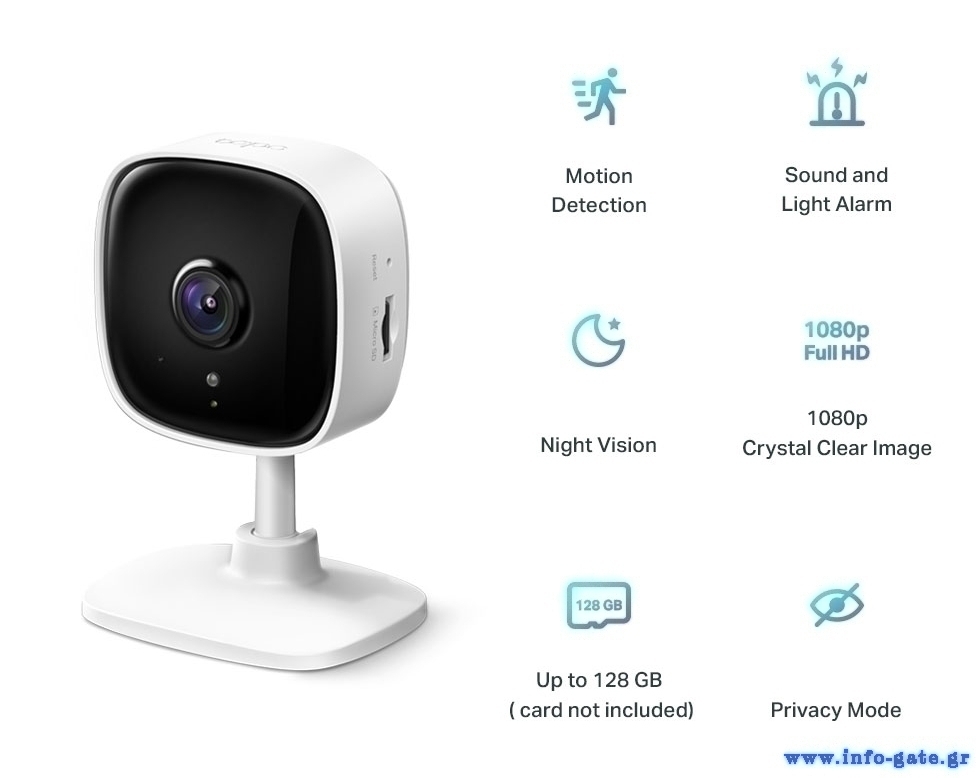Υποστηρίζει την τεχνολογία Motion Detection και Notifications, με την οποία ανιχνεύει κάθε κίνηση και ειδοποιεί με μήνυμα. Εξοπλίζεται με ηχείο και μικρόφωνο, επιτρέποντας την αμφίδρομη επικοινωνία με τα άτομα που βρίσκονται στον χώρο και έχει λειτουργία εκφοβισμού ανεπιθύμητων επισκετών με φως και ήχο.