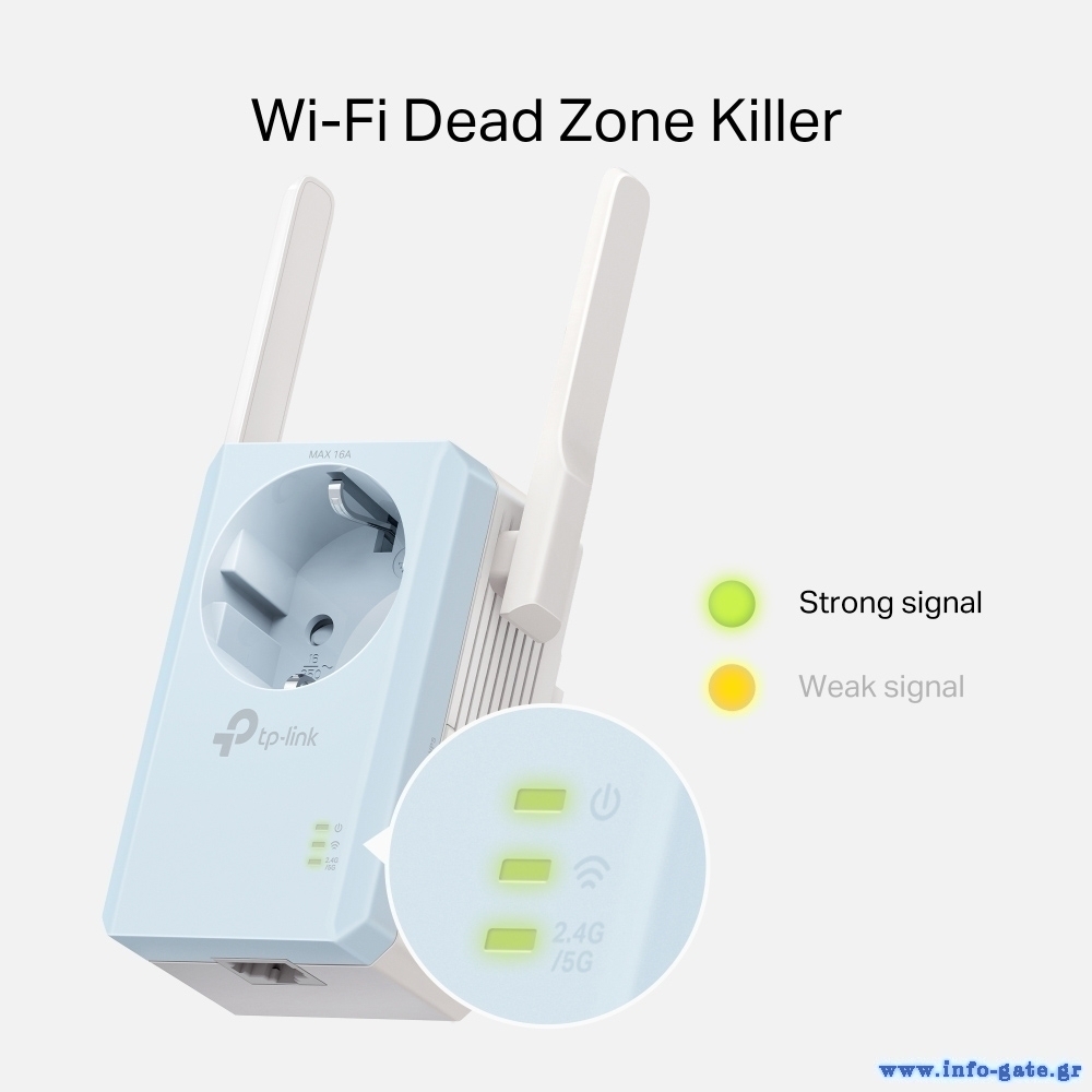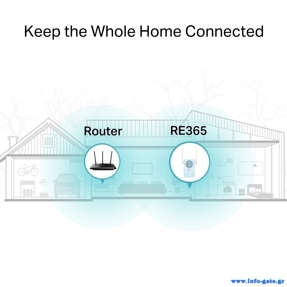 Έχετε κουραστεί από νεκρές ζώνες WiFi στο σπίτι σας; Το RE365 Range Extender συνδέεται ασύρματα με το router WiFi, ενισχύοντας και επεκτείνοντας το σήμα του έως και 930 τετραγωνικά μέτρα. Με ταχύτητες έως 300Mbps στα 2.4GHz και 867Mbps στα 5GHz, αντικαταστήστε τις νεκρές ζώνες με ισχυρό, γρήγορο WiFi σε κάθε δωμάτιο.