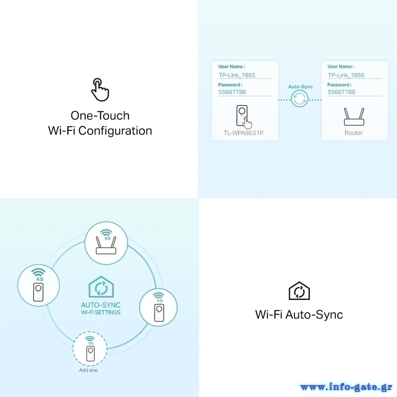 -Διαμόρφωση Wi-Fi με ένα πάτημα: Ένα πάτημα του κουμπιού Wi-Fi αντιγράφει το όνομα και τον κωδικό πρόσβασης δικτύου από το router σας. Τυχόν αλλαγές στις ρυθμίσεις θα εφαρμοστούν αυτόματα σε ολόκληρο το δίκτυο Powerline