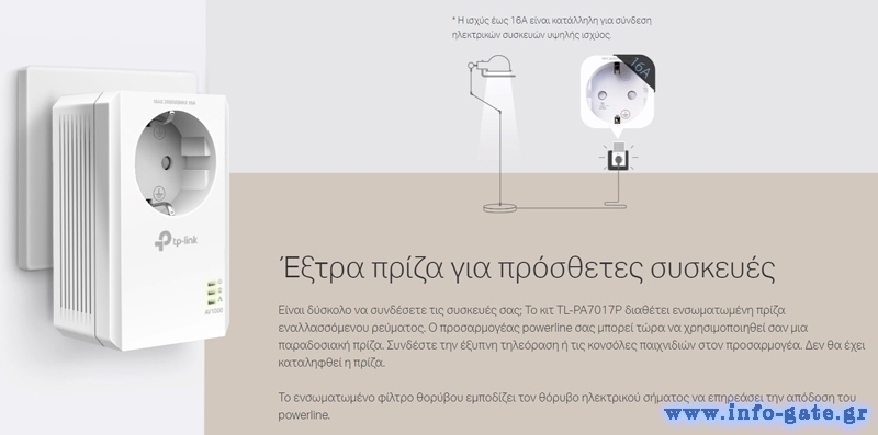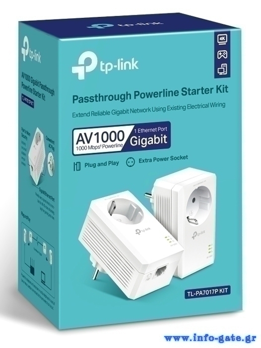 Starter powerline kit της TP-LINK με 2x AV1000 Gigabit passthrough powerline αντάπτορες TL-PA7017P και 2x καλώδια Ethernet.