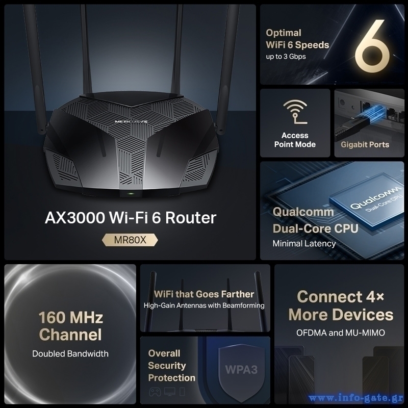 MERCUSYS router MR80X, Wi-Fi 6, 3Gbps AX3000, Dual Band