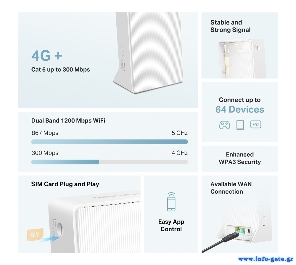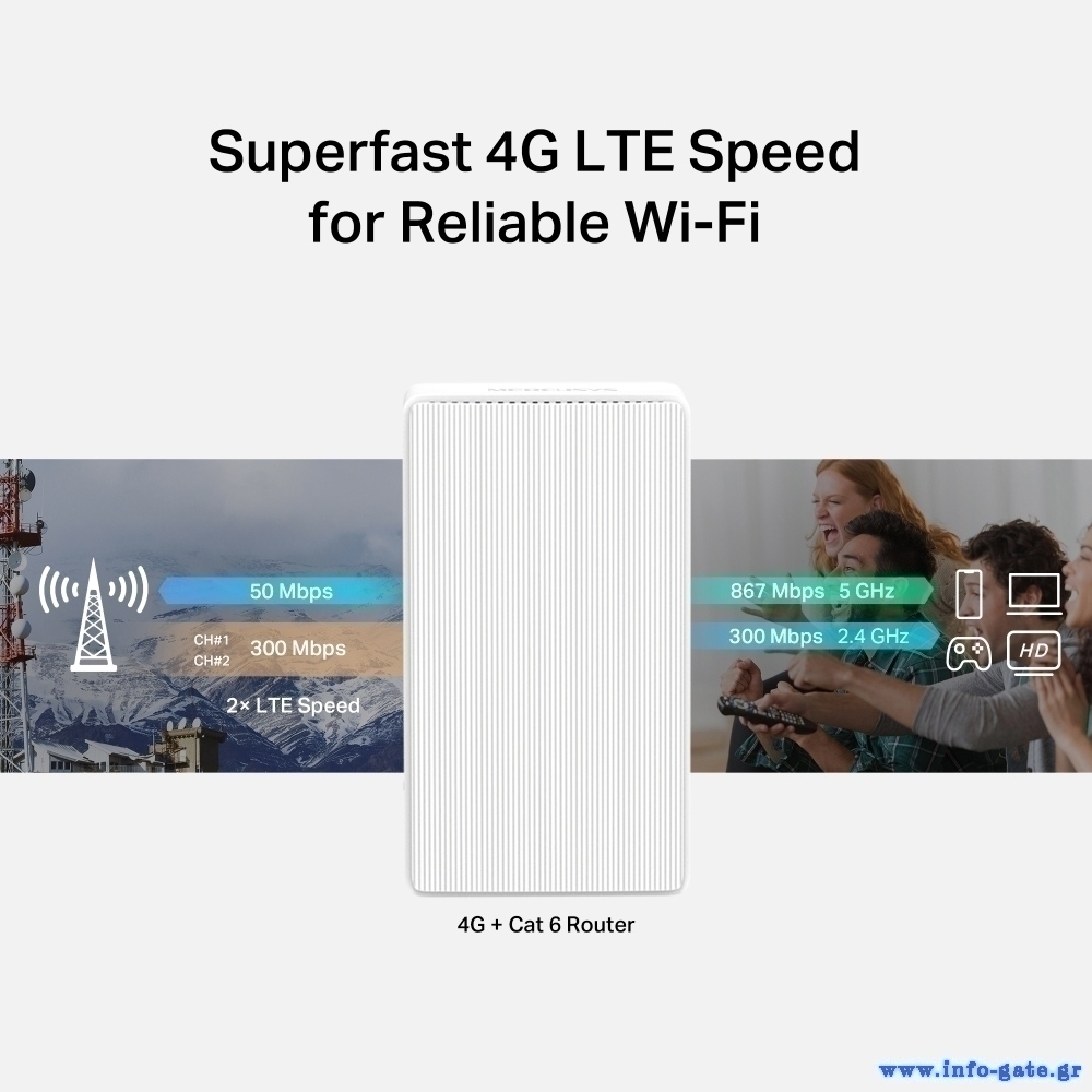 Μοιράστε ασύρματα στις συσκευές σας, το δίκτυο κινητής τηλεφωνίας 4G, μέσω κάρτας SIM, με download speeds έως 300Mbps.