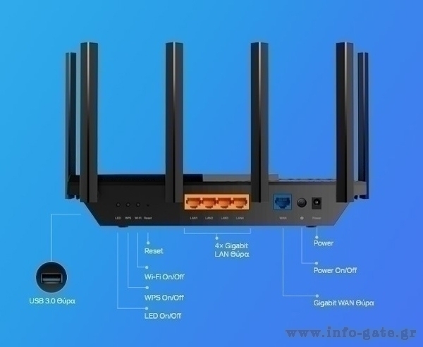 -Πλήρεις δυνατότητες Wi-Fi 6: Εξοπλίζεται με την κορυφαία δομή 4T4R και HE160 στη ζώνη των 5 GHz για να επιτρέπει εξαιρετικά γρήγορη σύνδεση 4.8 Gbps.