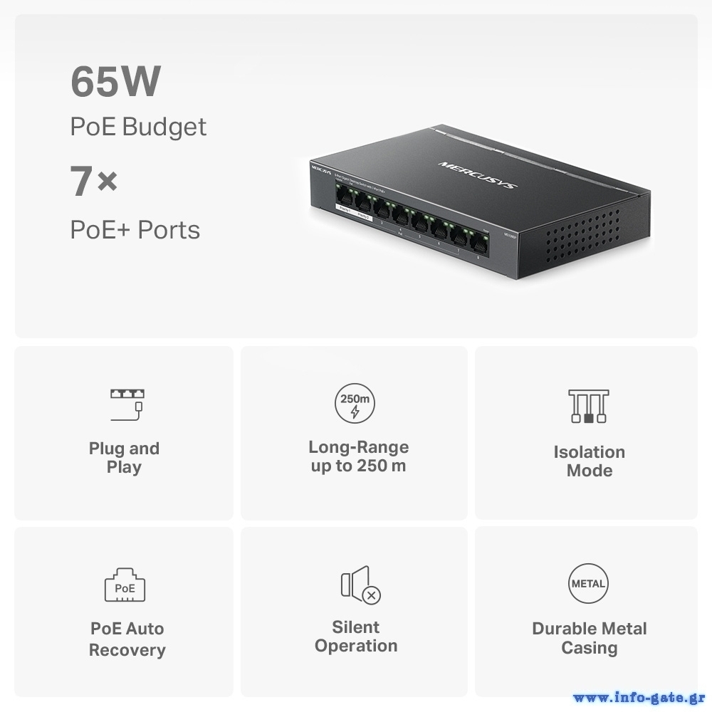 -High Power PoE+: υποστηρίζει PoE Power έως 30W για κάθε PoE θύρα και 65W για όλες τις PoE θύρες