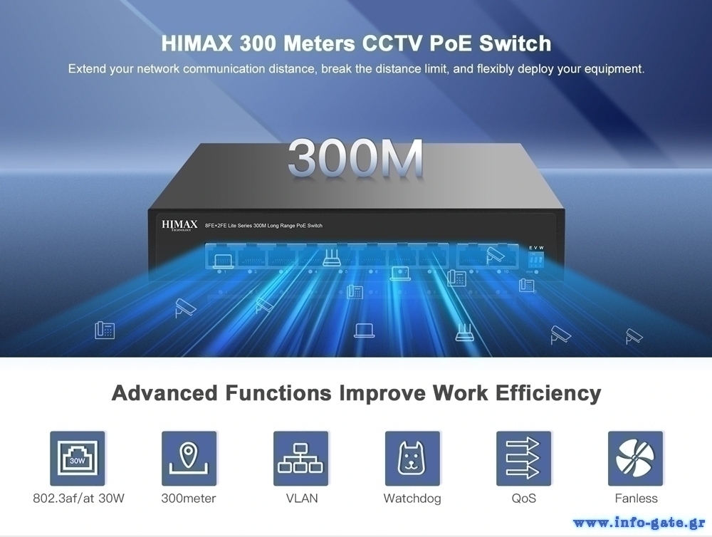 Το switch της HIMAX σας επιτρέπει να επεκτείνετε το ενσύρματο δίκτυο σας με 8x Ethernet PoE και 2x uplink Ethernet θύρες δικτύου.