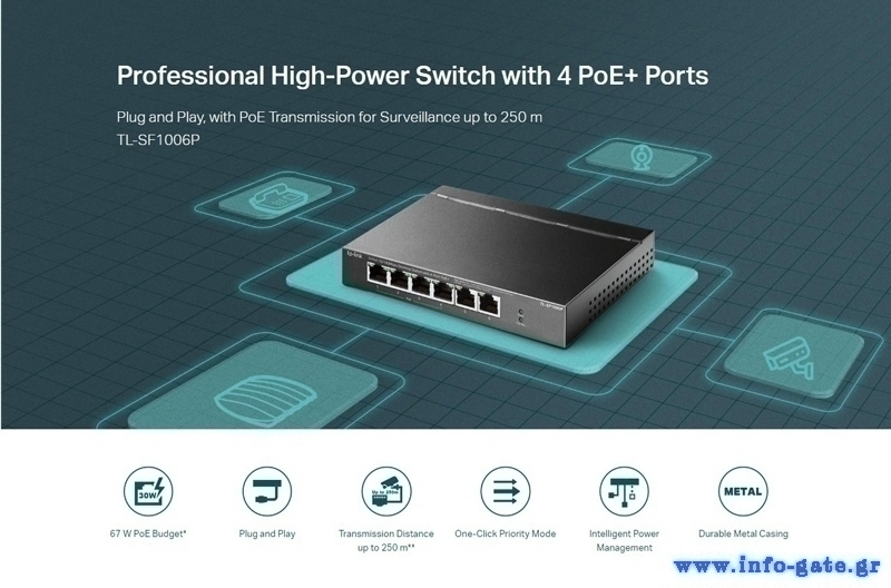 Το TL-SF1006P είναι ένα switch επαγγελματικών προδιαγραφών που εξοπλίζεται με 6 θύρες δικτύου με ταχύτητες 10/100Mbps. Από τις θύρες δικτύου που εξοπλίζεται, οι 4 υποστηρίζουν PoE+ για την μεταφορά δεδομένων και ισχύς με ένα μόνο καλώδιο.