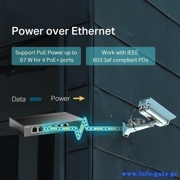 Είναι πλήρως συμβατό με συσκευές όπως κάμερες IP, access points τηλέφωνα IP, υπολογιστές, εκτυπωτές και IPTV.