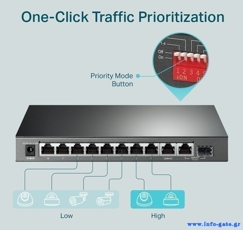 -Εξοπλισμένο με 8 PoE+ υποστηριζόμενες θύρες για μεταφορά δεδομένων και τροφοδοσία με ένα μόνο καλώδιο