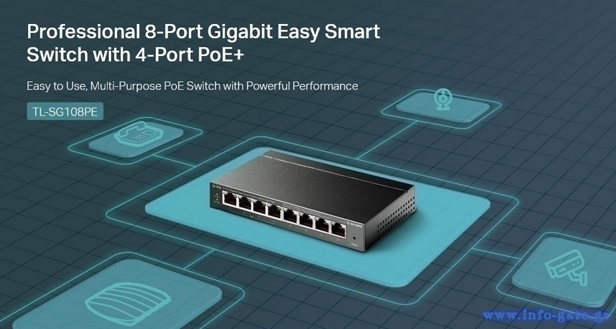 Το TL-SG108PE είναι ένα επαγγελματικό Gigabit Easy Smart Switch 8-θυρών με PoE 4 θυρών, πλήρως συμβατό με συσκευές PoE, όπως κάμερες IP, σημεία πρόσβασης και τηλέφωνα IP. Λειτουργεί επίσης με ενσύρματες συσκευές εκτός PoE, όπως υπολογιστές, εκτυπωτές και IPTV.