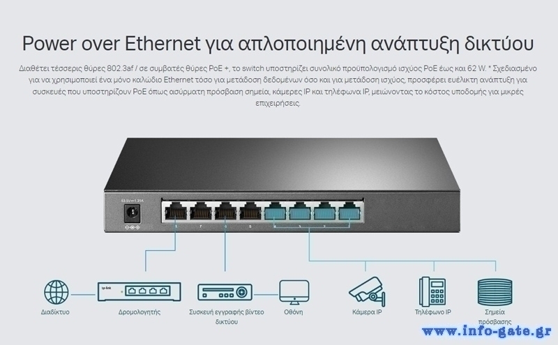 PoE Ports (RJ45): Πρότυπο: 802.3af / at compliant, Θύρες PoE: 4 θύρες, Τροφοδοσία: 62 W
