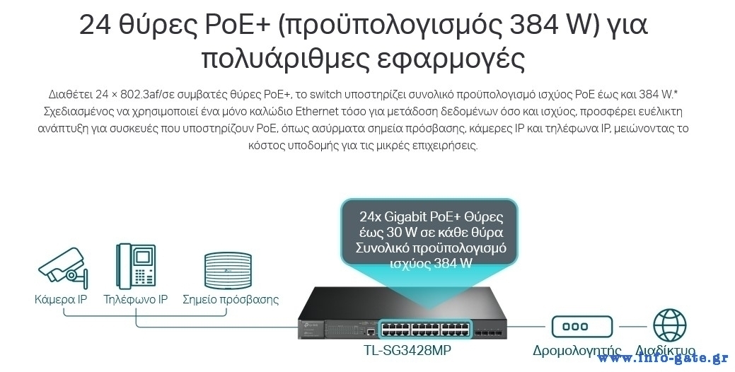 -24x Θύρες PoE+ 802.3at/af/af με συνολική παροχή ισχύος 384W