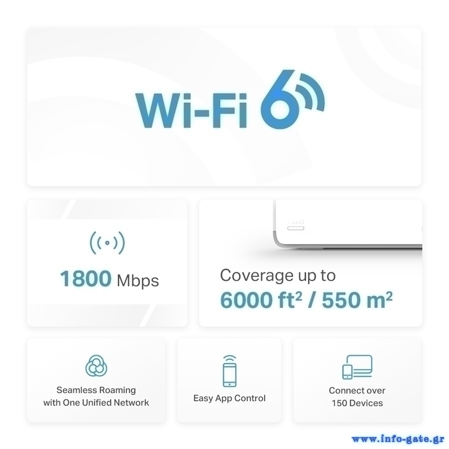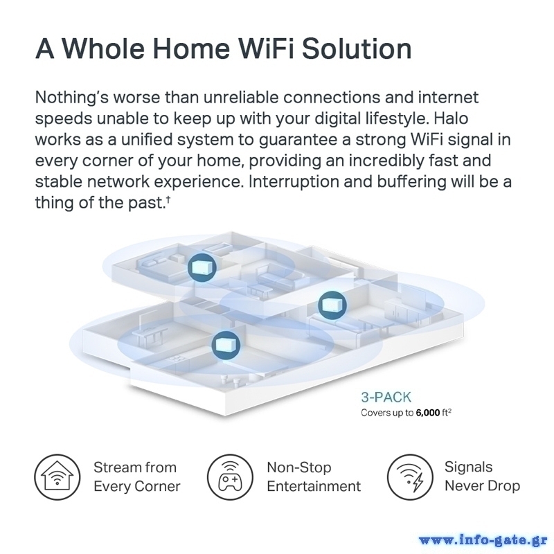 -Εξαλείφει τις νεκρές ζώνες στο σπίτι σας, με WiFi υψηλής ταχύτητας, με συνολική οικιακή κάλυψη έως 6.000 ft² (550 m²).