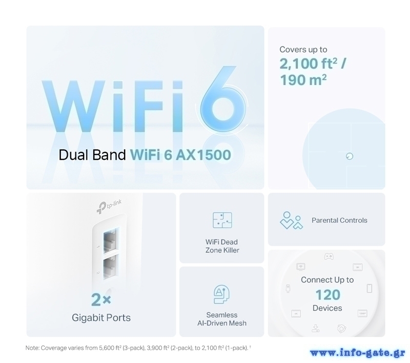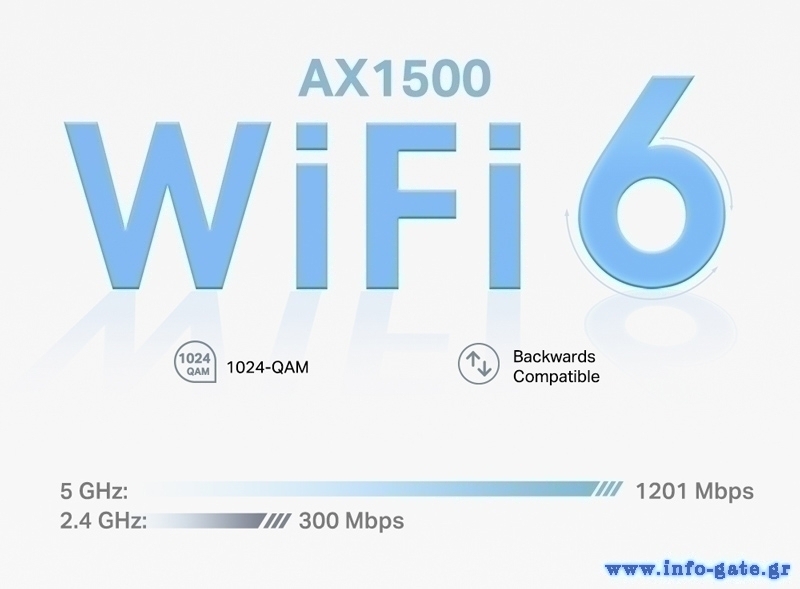 Wi-Fi 6 ταχύτητες έως 1500 Mbps, 1201 Mbps στα 5 GHz και 300 Mbps στα 2.4 GHz.