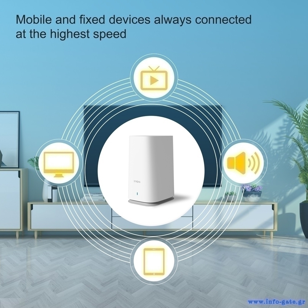 Αυτό το kit της STRONG συνδυάζει την τεχνολογία Mesh με το ισχυρό πρότυπο WiFi 802.11ac MU-MIMO (WiFi 5) για γρήγορες ταχύτητες WiFi με μεγάλη κάλυψη σε όλο το σπίτι.