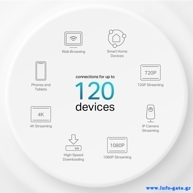 Τετραπλή χωρητικότητα τεχνολογίας OFDMA και MU-MIMO για ταυτόχρονη μετάδοση σε έως 120 συσκευές.