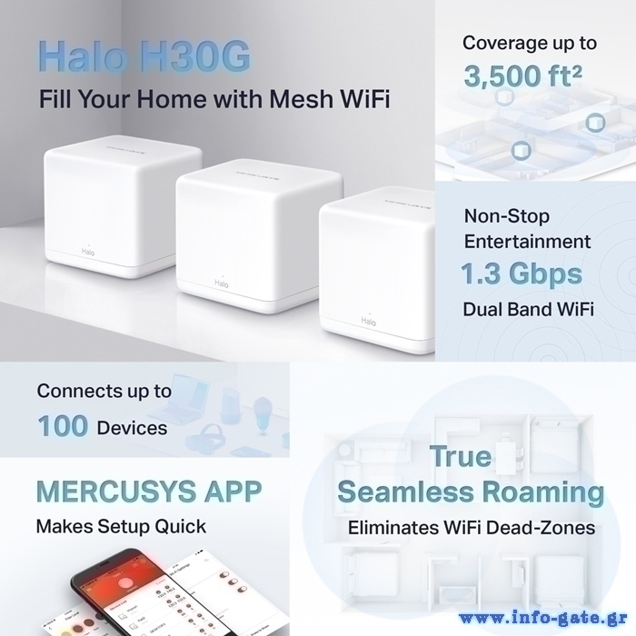 -1.3 Gbps dual band WiFi: Το Halo H30G παρέχει γρήγορες και σταθερές συνδέσεις έως και 100 συσκευών με ταχύτητες έως και 1.300 Mbps και συνεργάζεται με μεγάλους παρόχους υπηρεσιών διαδικτύου (ISP) και μόντεμ.