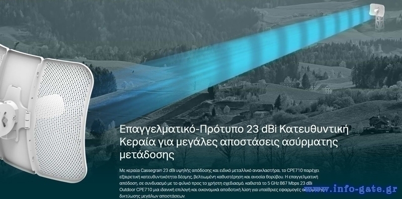 Το CPE710 της TP-LINK με υψηλής απόδοσης κεραία 23 dBi 2 x 2 MIMO, προσφέρει σταθερό Wi-Fi για μετάδοση σε μεγάλες αποστάσεις με ταχύτητες έως 867Mbps στη ζώνη 5GHz.
