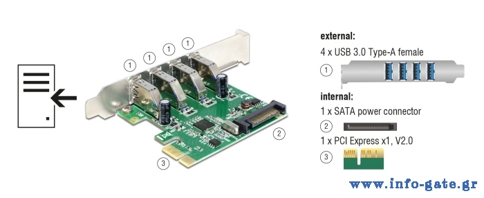 Αυτή η κάρτα PCI Express της Delock διευρύνει τις θύρες του PC σας με 4x USB εξωτερικές θύρες. Διαφορετικές συσκευές USB, όπως docking stations, card readers κ.λπ. μπορούν να συνδεθούν στην κάρτα.