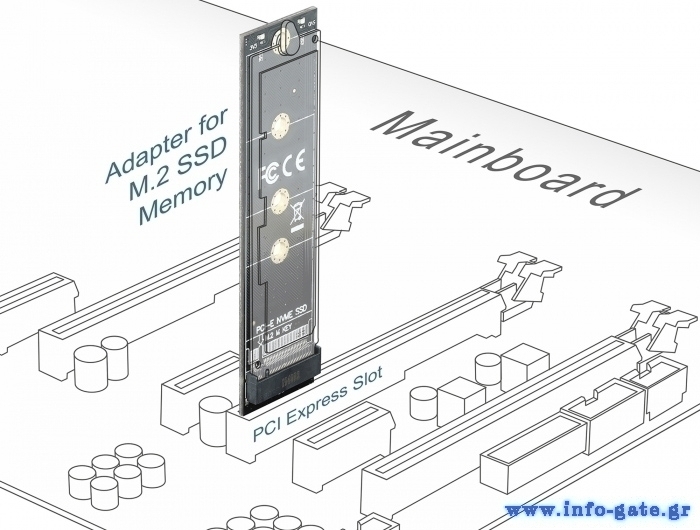 This adapter by Delock enables the connection of an M.2 SSD in 2280, 2260, 2242 and 2230 format. The data transmission occurs directly via the PCI Express slot.